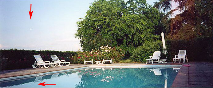 Nous n'avons pas réussi à voir le point lumineux, même en agrandissant la photo - GREPIAu début j'ai pensé à un reflet ou défaut du dévelopement, mais sur cette photo il y a la piscine de la propriété où j'habitais et, gros coup de chance, sur cette deuxième photo il y a le reflet de ce même point lumineux visible à la surface de l'eau, donc pour moi il n'y a pas eu un défaut photo, pourtant j'affirme ne rien avoir vu au moment de ces photos (photos dont je dispose sans pour autant être extraordinaires), mais être tout de même troublante.