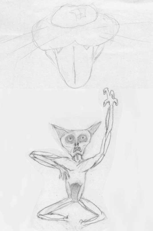 C'était une belle journée. Le soleil tapait fort et nous avions fini de manger. Mme I. venait nous rendre visite. J'en profitai pour sortir et laissai ma mère discuter. Je fis environ 4 à 5 mètres lorsque j'aperçus Rex qui était couché et me regardait, les pattes de devant croisées, il avait entre ses pattes un animal (c'est comme cela que je le définis car c'est à cela qu'il ressemblait le plus), il était en train de le lécher. "L'animal" n'était pas à quatre pattes comme peut se tenir un chat ou mammifère connu, mais assis au milieu des pattes du chien. J'ai remarqué tout de suite que cette chose n'avait pas de peau. Elle faisait environ 20 à 30 centimètres, était assise et bougeait les bras, les doigts, la tête et la bouche. Ses yeux ressortaient des globes oculaires. Je voyais ses muscles gris, lisses, sans veines apparentes, ni sang. Au niveau de l'abdomen, je ne voyais pas d'organes, juste des fibres musculaires et comme un trou. La chose avait des oreilles pointues, de la taille et forme de celles d'un chat, mais sans poil. Le chien léchait ce qu'il avait entre les pattes et j'avais l'impression d'une grande détresse de la part de cette chose. Elle levait les bras et la tête en regardant le chien et ce dernier la léchait régulièrement.
