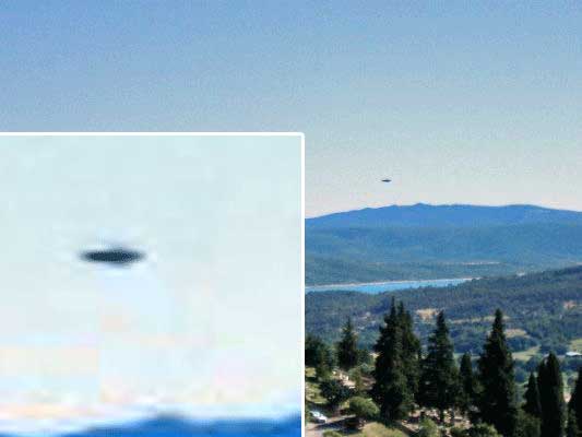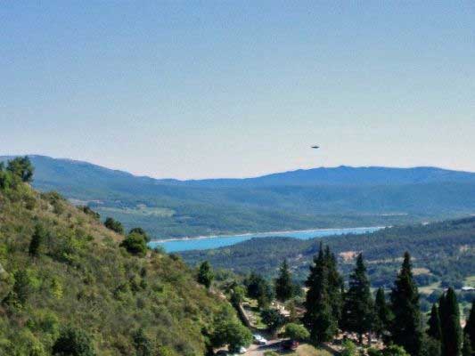 Sur le chemin je me suis arrêté sur le bord de la route pour prendre des photos à un endroit où on domine le lac et ciel bleu magnifique. J'ai pris quelques photos de cet endroit, et le jour même je n'ai rien vu. En rentrant chez moi, j'installe les photos sur mon PC. Un mois et demi plus tard, le 14juillet, j'ai assisté au feux d'artifice de Gréoux les Bains, j'ai aussi fait des photos que j'ai installé sur mon ordi et j'ai passé en revue tous mes clichés. Quand arrive la photo en question, mon regard est attiré par un objet bizarre dans le ciel, je n'en ai jamais vu de tel, ce n'était ni un avion, ni un hélicoptère, oiseau, tache sur l'objectif. On dirait une soucoupe volante, il en a la forme, on dirait qu'il est argenté, je ne pense pas que ce soit un ballon sonde, ça m'intrigue beaucoup, est-ce vraiment un ovni??? et je ne sais pas à quelle vitesse il se déplaçait.