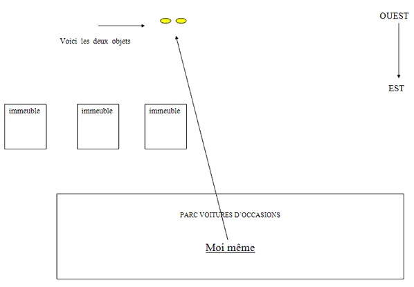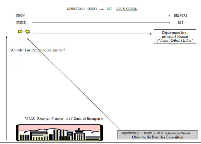 Que faisiez-vous au moment où débuta votre observation, comment votre attention a-t-elle été attirée par le phénomène? Promenade dans les allées du parc puis soudain mon regard se dirige vers ces deux objets, je pensai d'abord voir au loin deux gros oiseaux, mais j'ai bien vite compris, qu'il s'agissait de deux objets, deux petits objets qui semblaient vibrer et qui avançaient très doucement...