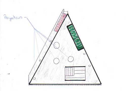 Je décide donc de regarder par la fenêtre de mon bureau pour essayer d'apercevoir l'objet... je ne vois rien... quelques secondes plus tard le grondement semble se rapprocher encore, je décide donc de regarder à nouveau par la fenêtre, et là... j'en tremble encore, j'ai pu observer pendant environ 5 secondes un immense triangle gris ardoise avec trois projecteurs blancs de forte puissance ainsi qu'une barre de lumière verte sur le côté droit de l'objet, et plusieurs petits projecteurs disséminés sur l'ensemble. L'objet se déplace très lentement, 60 km/h d'après mon estimation, sur une trajectoire allant du nord-est vers le sud-ouest, à très basse altitude, je dirais moins de 500 mètres, le ciel est clair et dégagé, pas de vent, bonne visibilité. Quant à l'objet, il semble mesurer plusieurs centaines de mètres. Je pense être à ce moment-là à 1 ou 2km maxi de l'objet. Pris de panique je décide de saisir mon appareil photo, et de réveiller ma petite amie pour observer le phénomène depuis la fenêtre de la chambre... Hélas, le temps que je change de pièce et que je réveille ma compagne, je perds l'objet de vue... depuis la fenêtre de la chambre je ne vois plus l'objet, mais j'entends toujours le grondement, qui s'éloigne très lentement, cela va durer encore 5 bonnes minutes, mais sans contact visuel.
