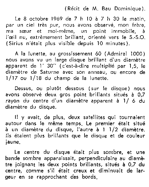 - Oui, on se croyait isolés tous les 3, mais je me suis aperçu quelques mois plus tard que d'autres ont vu cet objet à l'oeil nu et ont averti les autorités. Ce que nous n'avons jamais fait pour notre part. Nous avons envoyé notre observation à la société astronomique qui en a publié un résumé et grâce à un collègue de lycée qui lui était "branché", nous l'avons envoyé à Lumières Dans La Nuit. 20 ans plus tard, nous avons appris par des tiers qu'une personne possédant un télescope a fait la même observation (de 1969). Il s'agit de Y. B. dont nous n'avons pas pu retrouver le témoignage direct. Dommage!