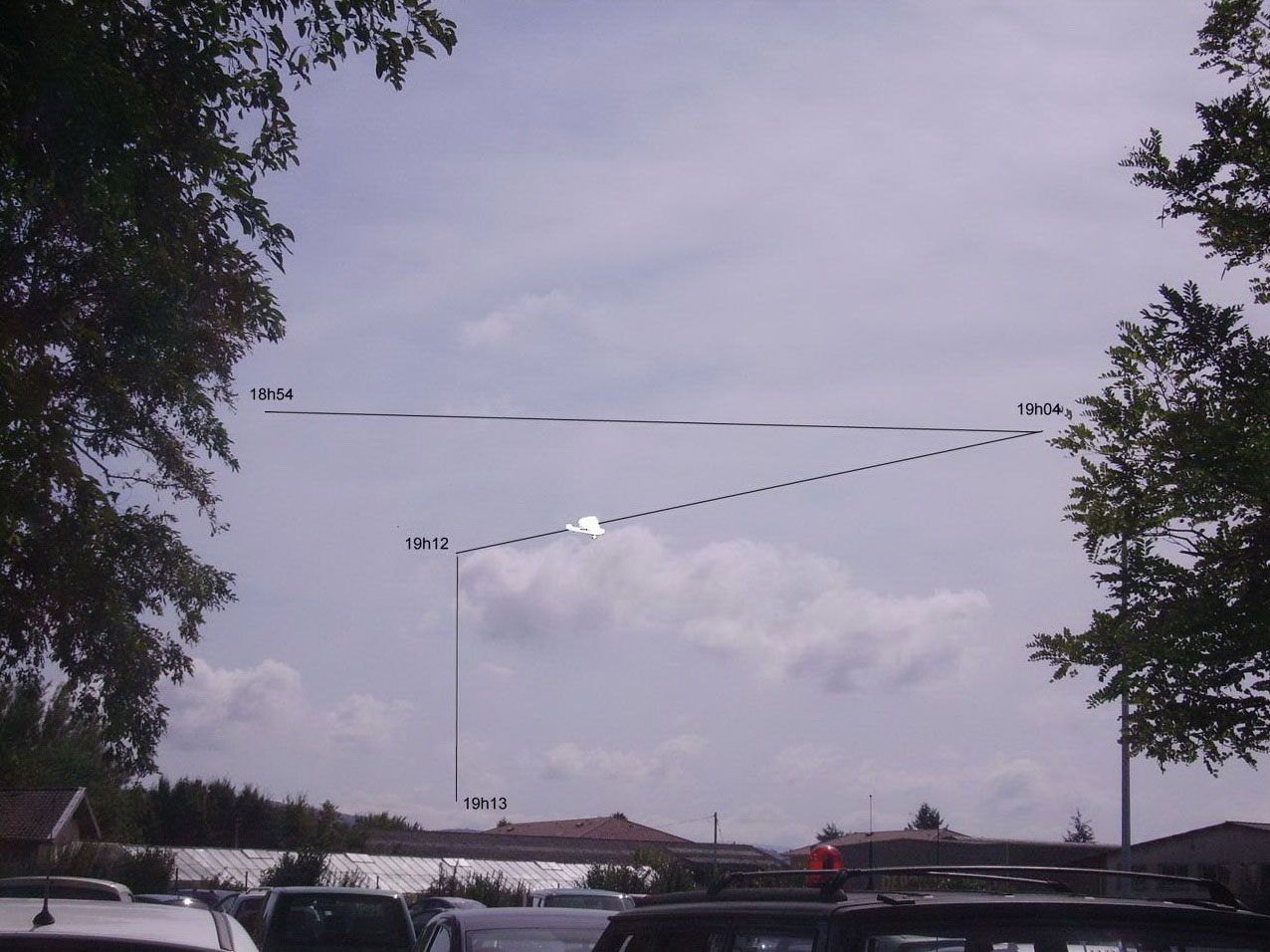 Alors je me dis que c'est peut-être dû à la rotation de la Terre. Le mouvement continue jusqu'au prochain arbre et il s'arrête à 19h04. C'est à ce moment que je reste perplexe et la supposée étoile retourne en sens contraire jusqu'à 19h12 où elle entreprend une chute vertigineuse en une minute seulement. Fin de l'histoire à 19h12 où l'objet disparait derrière les montagnes du Revermont. Une petite avionnette volait vers l'ouest qui avait décollé de l'aérodrome de Bourg-en-Bresse.Je calcule qu'il a pu se tenir à 30km de mon emplacement.