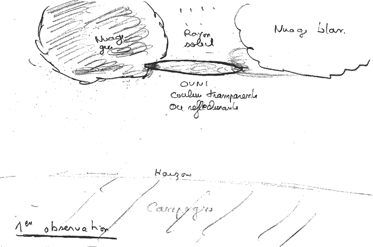 Soudain, dans une trouée lumineuse, assez haut dans le ciel puisque les premiers nuages le touchaient, j’ai aperçu un grand objet qui réfléchissait la lumière environnante. Je distinguais nettement une forme comme un grand Zeppelin assez aplati, sans nacelle ni gouvernail.