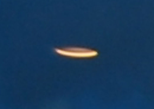 Apparence: un objet de couleur gris métallique foncé, uniforme, avec un halo orange très fort tout autour et avec deux traînées de condensation ou de fumée.