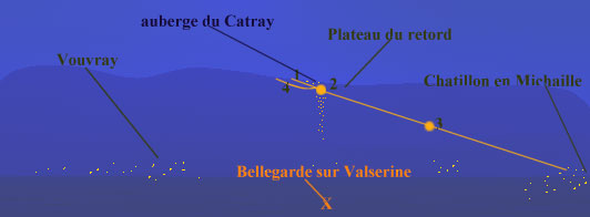 L'objet est parti (peut-être passait-il) d'à côté de l'auberge du Catray visible le jour depuis Bellegarde (1) en se dirigeant vers Bellegarde et stationnant presque en dessus de l'aérodrome (peut-être avant).